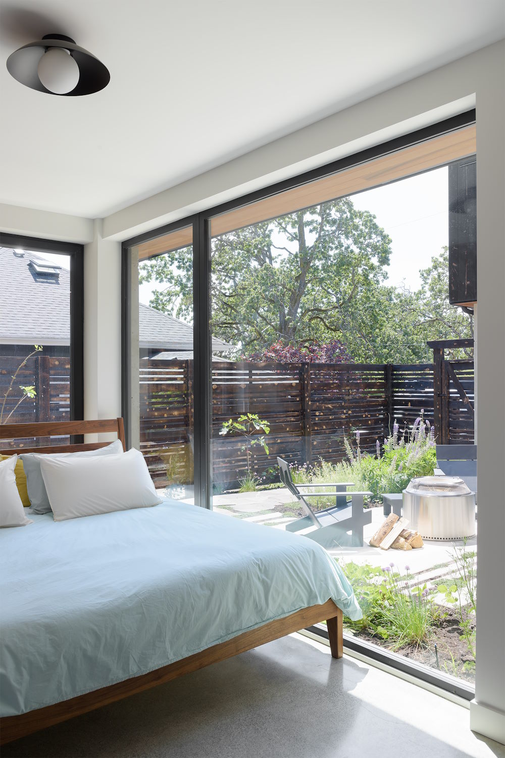 This modern urban home features a concrete base that contrasts with the warm, Shou Sugi Ban cedar cladding on the upper floor, creating a contemporary and inviting front facade that opens up to a hidden courtyard beyond.