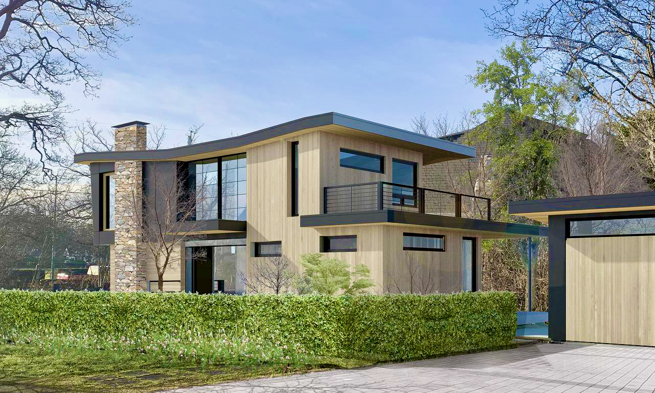 The material palette responds to both West Coast tradition and contemporary living: warm cedar siding anchors the composition, stacked stone provides textural depth and permanence, while dark standing-seam metal and charcoal panels define the upper volume. Generous glazing floods interiors with natural light despite the site’s tree canopy and tight lot lines.